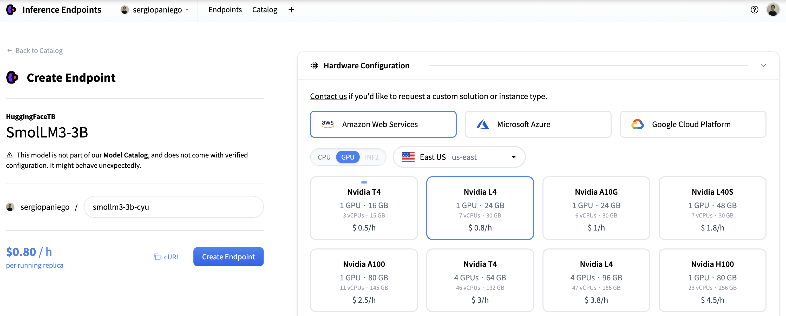 DEPLOYMENT_URLwith the URL provided in the console, remembering to append/v1as required.# pip install openai from openai import OpenAI import os client = OpenAI( base_url = DEPLOYMENT_URL, api_key = os.environ["HF_TOKEN"] # https://huggingface.co/settings/tokens ) chat_completion = client.chat.completions.create( model = "HuggingFaceTB/SmolLM3-3B", messages = [ { "role": "user", "content": [ { "type": "text", "text": "Give me a brief explanation of gravity in simple terms." } ] } ], stream = True ) for message in chat_completion: print(message.choices[0].delta.content, end = "")